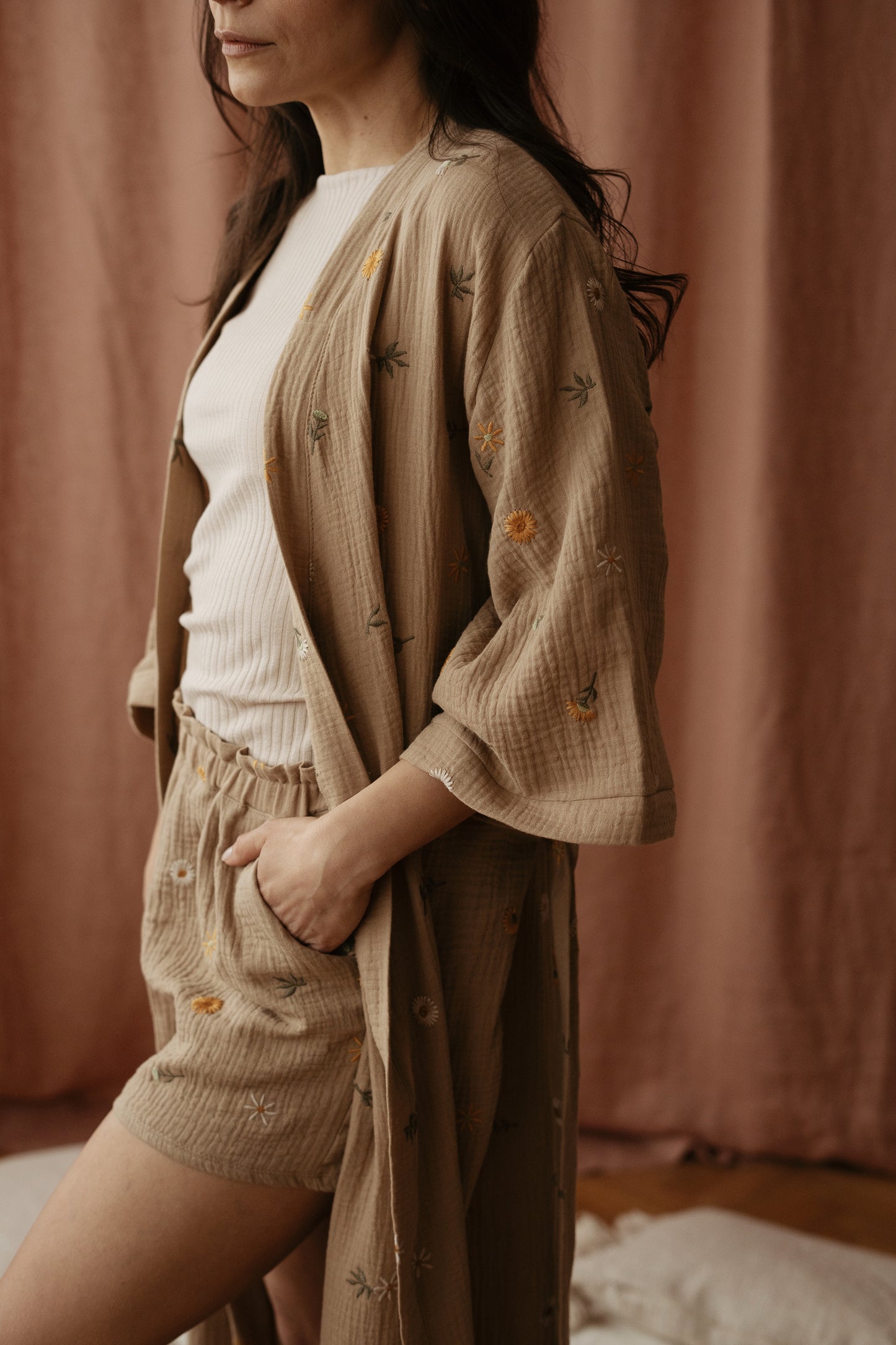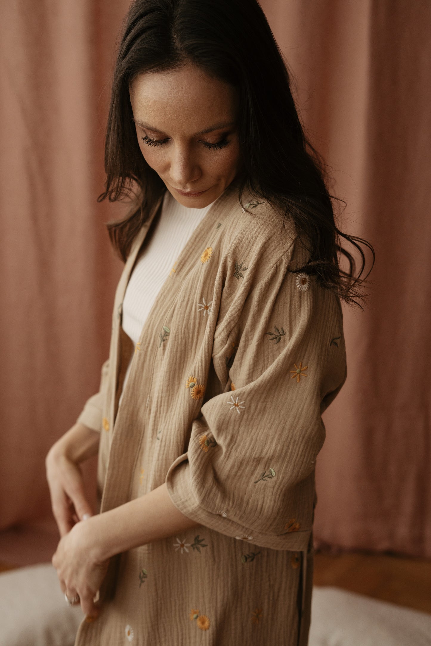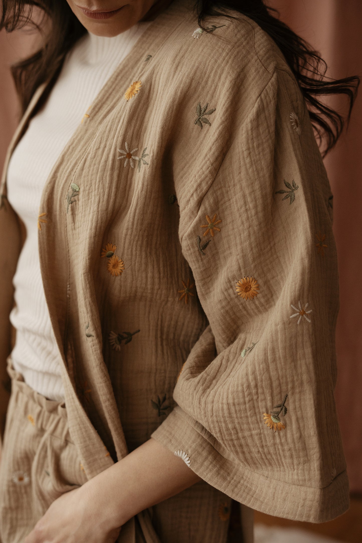 Čas je, da se sprostite in si vzamete trenutek zase. Udobna in razkošna ročno izdelana halja iz najmehkejšega muslina s cvetličnim vezenjem, vam bo pričarala občutek sproščenosti in prizemljenosti. Privoščite si ta čas zase, uživajte v najljubši kavi in cenite te dragocene trenutke v svojem življenju.