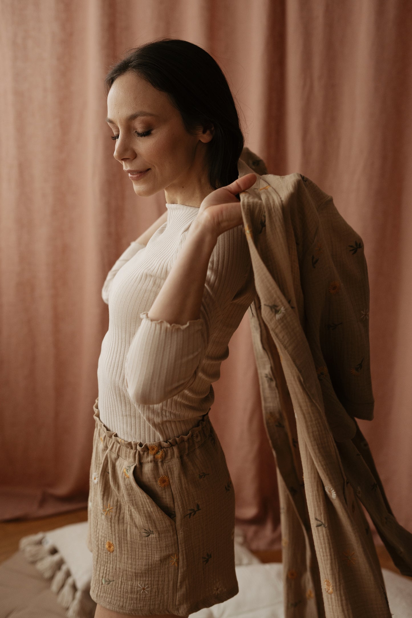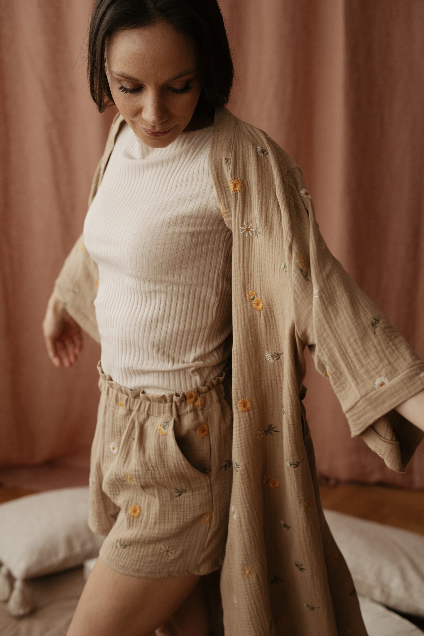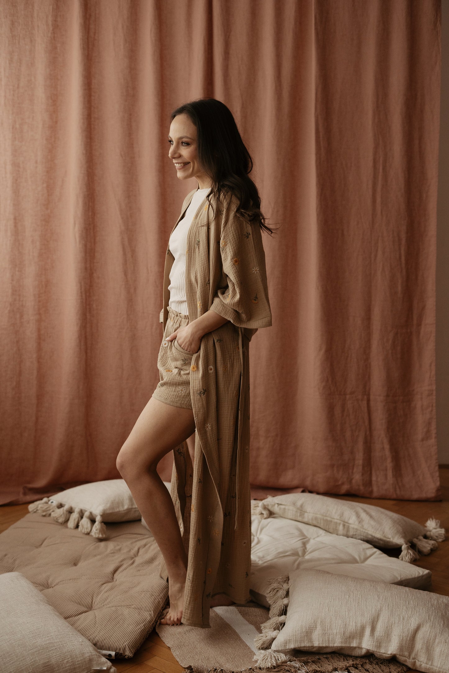 Čas je, da se sprostite in si vzamete trenutek zase. Udobna in razkošna ročno izdelana halja iz najmehkejšega muslina s cvetličnim vezenjem, vam bo pričarala občutek sproščenosti in prizemljenosti. Privoščite si ta čas zase, uživajte v najljubši kavi in cenite te dragocene trenutke v svojem življenju.