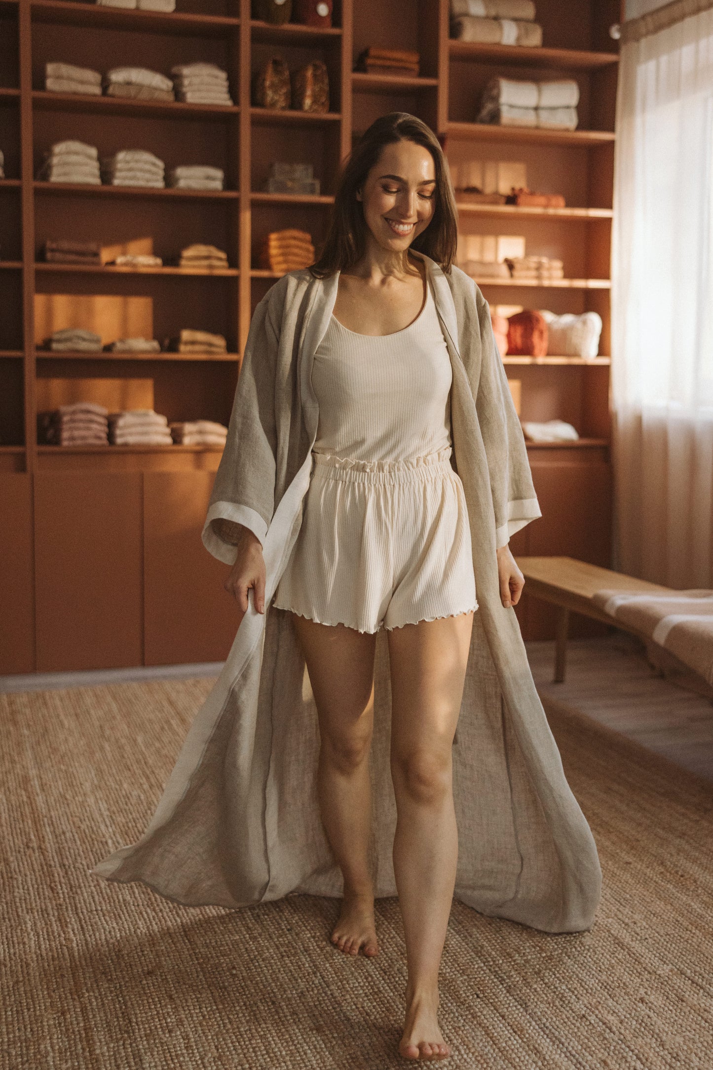 Available in a curated palette of timeless, earthy colours, each robe drapes naturally and moves with ease — perfect for slow mornings, creative days, and cozy evenings at home.