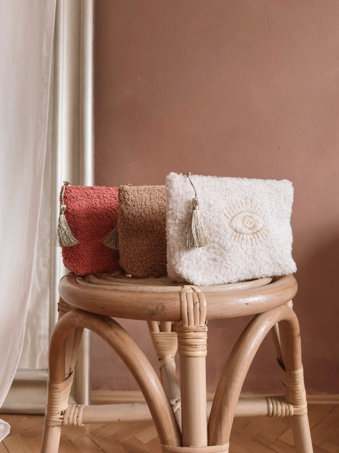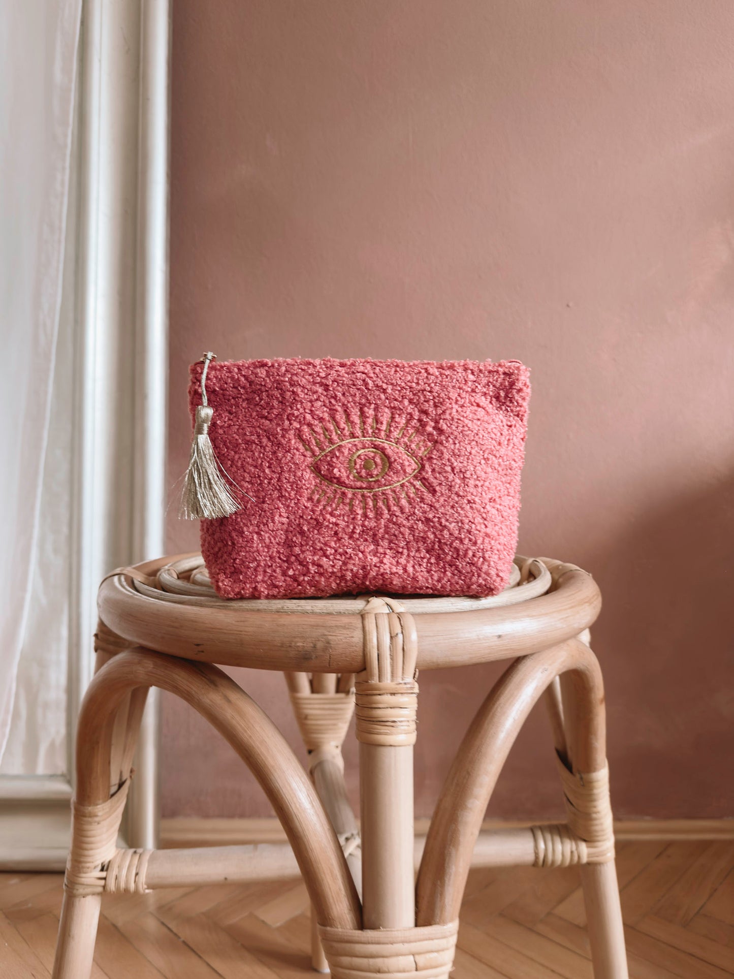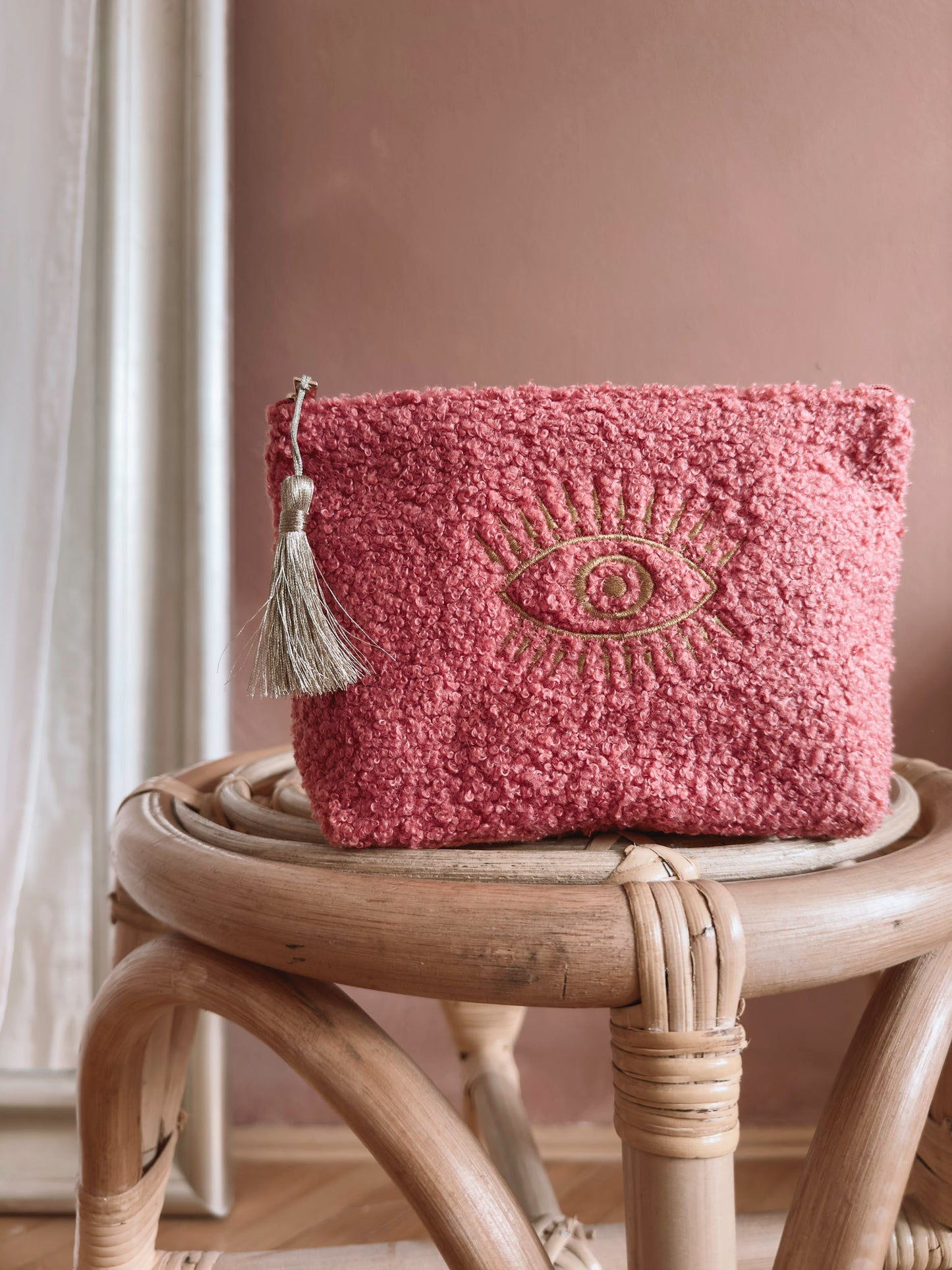 Organizirajte svoja ličila z našo čudovito mehko torbico za ličila iz čudovitega boucle blaga.